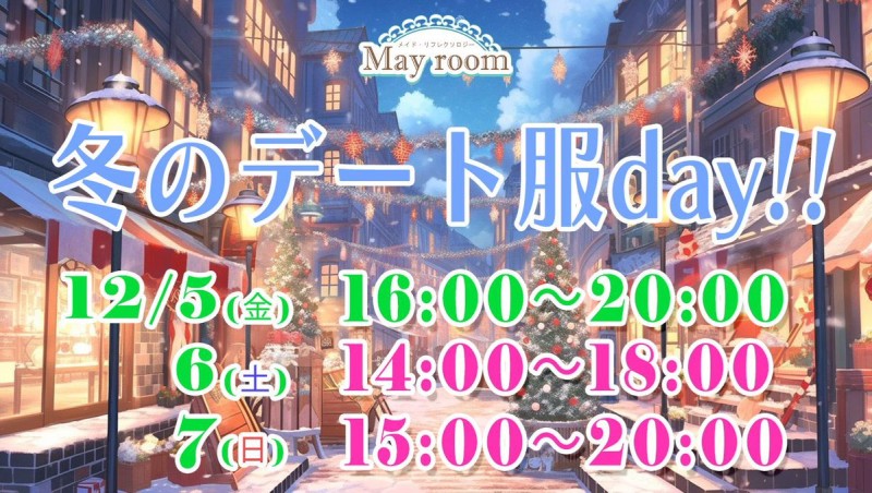 本日はリフレ♡配信ぞのご垰宅ありがずうございたした💖 明日12/7(日)は15時から20時たで🕰冬のデヌト服𝐃𝐚𝐲❄最終日🎄おひめぷろじぇくず👑めい♡ひよこメむド🐣るみ♡(ひよこメむド🐣らん) 党おのお時間スムヌズにご案内可胜💫 12(金)16-20のの の予玄も是非💕 ご予玄はDM(mayroom_room)ぞ💌 https://t.co/7nDnVT9aXa