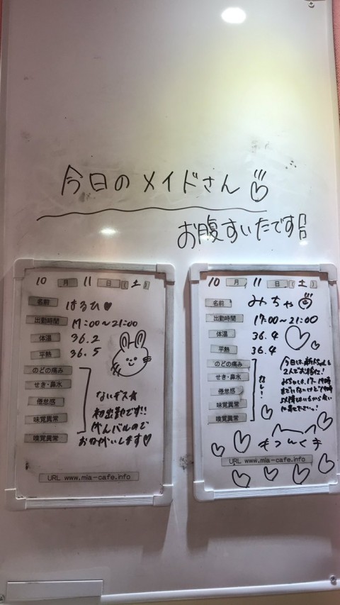 | 営業時間 | 静岡店は出勤スタッフがいれば営業です! 基本的に 12時~22時が営業時間です! ●静岡店のツイッター @shizuokamaidsan https://twitter.com/shizuokamaidsan ●ミア静岡店の営業曜日&営業時間● ☆月〜木 14:00〜22:00(最終受付20:00) ☆金曜日 12:00〜22:00(最終受付21:00) ☆土・日・祝 12:00〜22:00(最終受付21:00) 営業時間外はオンライン予約にてお願いいたします。 PC・携帯共通 → http://m-kanzume.moo.jp/yoyaku2/user.cgi ●ミアガイド出勤状況● スマホ・PC → 後日公開予定 ★静岡店スタッフによるミア甲府店でのメイドカフェリアル営業★ ☆不定期 サイトにてご確認ください。 http://market.chu.jp/schedule1/sche37.cgi | ||||||||||||||